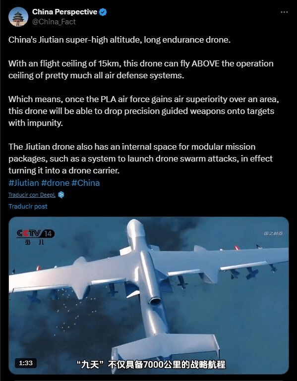 China busca mostrar músculo tecnológico, impulsar su industria de defensa (recordemos: es el mayor exportador mundial de drones militares) y enviar una señal directa a Washington y sus aliados, en plena tensión geopolítica por Taiwán. El Jiu Tian es así más que un arma: es una declaración estratégica sobre el futuro de la guerra.