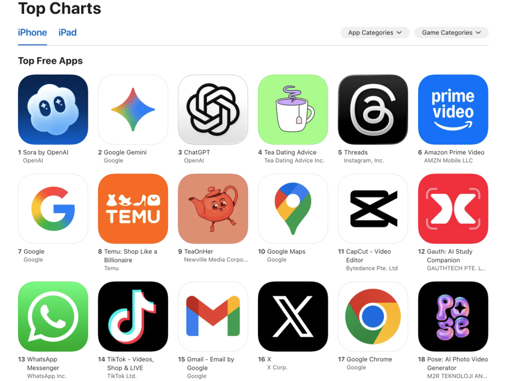 Lo que antes fue territorio de WhatsApp, Facebook o Messenger, ahora lo reclaman las apps de OpenAI. En el ranking general de la App Store en Estados Unidos, la primera aplicación de Meta aparece recién en la cuarta posición con Threads, mientras que WhatsApp cae hasta el puesto número 13.