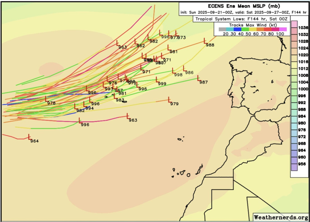 Hasta ayer, los 50 modelos meteorológicos más probables coincidían: Gabrielle se acercará “a nuestra región con altas probabilidades de sufrir una transición extratropical de gran intensidad”. Esto significa que el huracán podría transformarse en una borrasca potente justo frente a las costas de la Península Ibérica, un fenómeno meteorológico complejo y digno de seguimiento.