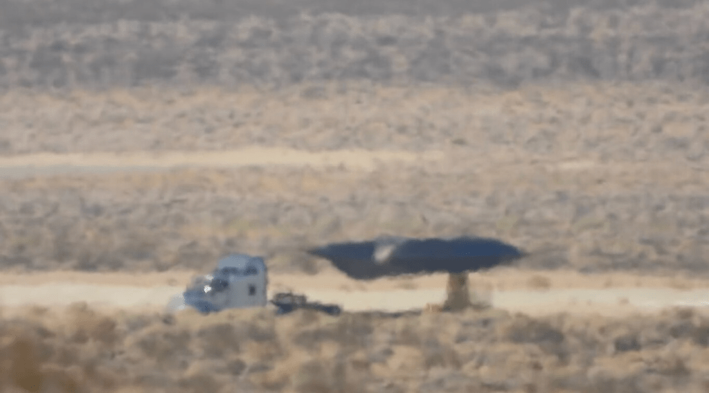 Casi al mismo tiempo que ocurría el accidente en Nevada, en el centro de pruebas de Lockheed Martin en Helendale, California, se registró un hallazgo intrigante. Un objeto oscuro con forma romboidal, similar a una manta o un ala volante, apareció montado sobre un pilón durante un ensayo de sección radar.