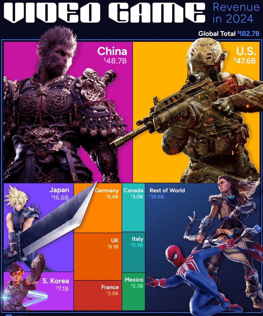 El gráfico elaborado por Visual Capitalist, basado en datos de Newzoo —una firma de referencia en análisis del sector— revela una realidad clara: aunque los números pueden variar según la fuente, hay dos mercados que dominan el panorama mundial de los videojuegos.