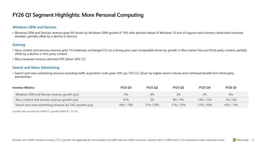 Durante el trimestre cerrado el 30 de septiembre de 2025, los ingresos de Xbox por contenido y servicios aumentaron un 1 % interanual, impulsados principalmente por el crecimiento de Game Pass y las ventas de juegos de terceros. Estas dos fuentes de ingresos compensaron, en parte, la caída registrada en los títulos first-party del ecosistema Xbox.