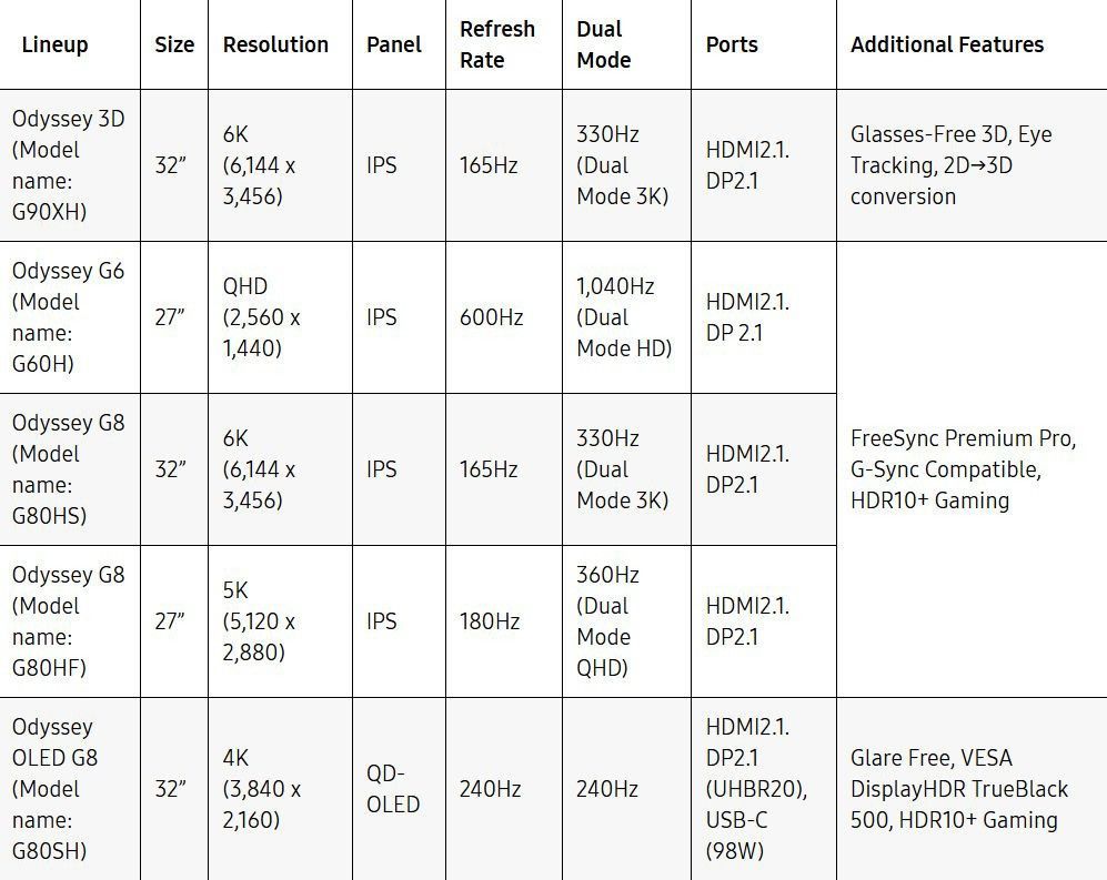 La nueva familia estará encabezada por un monitor con 3D sin gafas y resolución 6K, así como por otro panel capaz de alcanzar una frecuencia de actualización récord de 1.040 Hz. Salvo indicación contraria, todos los modelos emplean paneles IPS y cuentan con conectividad HDMI 2.1 y DisplayPort 2.1. Samsung, por ahora, no ha comunicado precios ni fechas concretas de lanzamiento.
